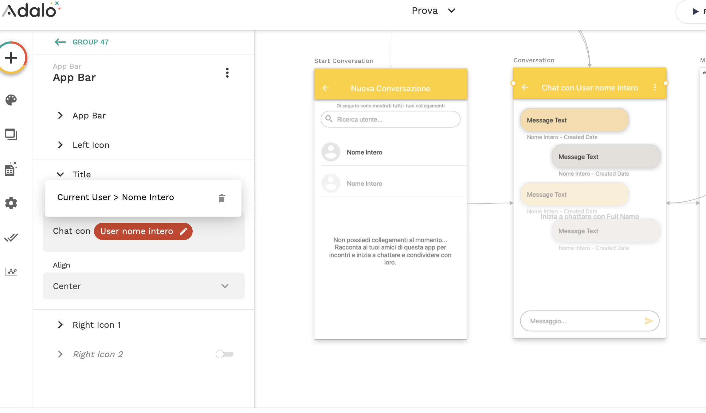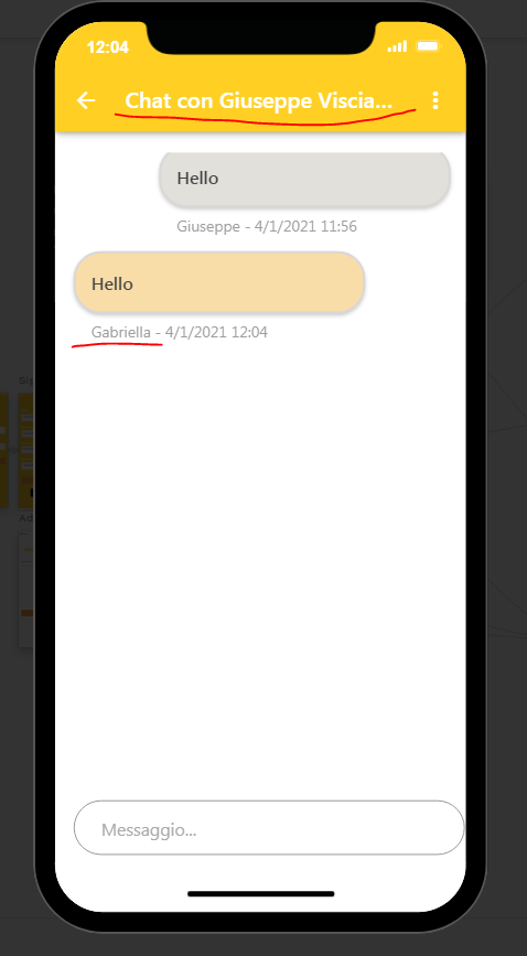 Once the conversation has been created and then inside it, as you can see, the username (current user = Gabriella) of the friend you are chatting with is displayed CORRECTLY.