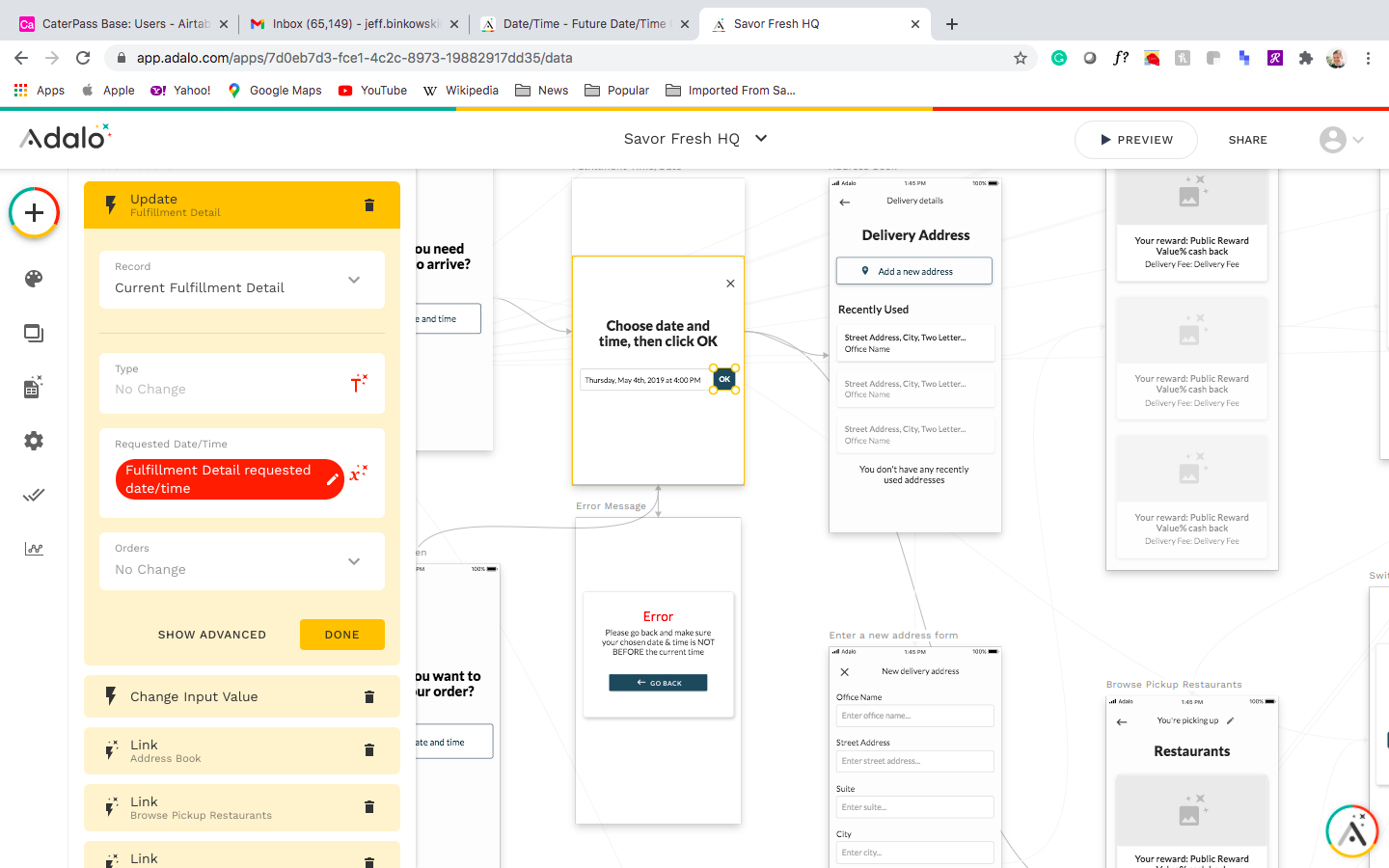 Hey @James_App_Maker. You’ll see the logic I’ve created on some of the actions, which sends User to various screens based on ‘PICKUP ORDER’ or ‘DELIVERY’, plus my attempt to show an error message based on DATE/TIME. Some screenshots below.