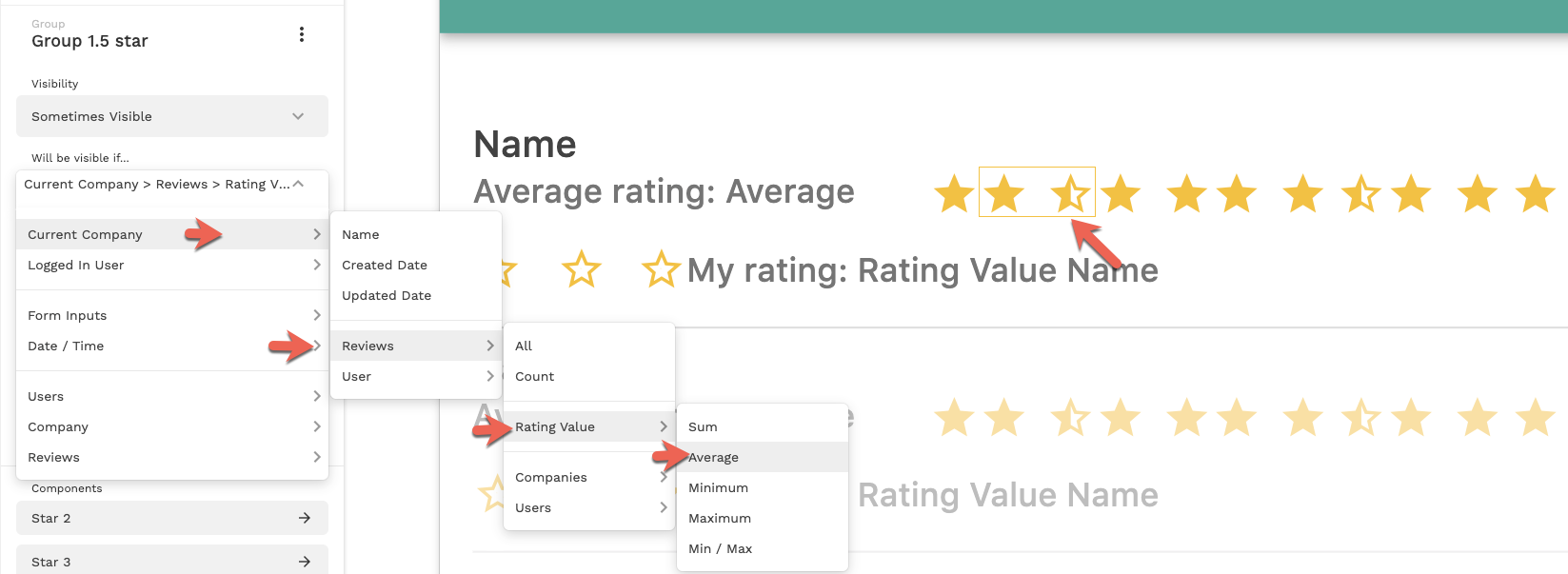 The star rating display is done with 5 groups of stars with conditional visibility: