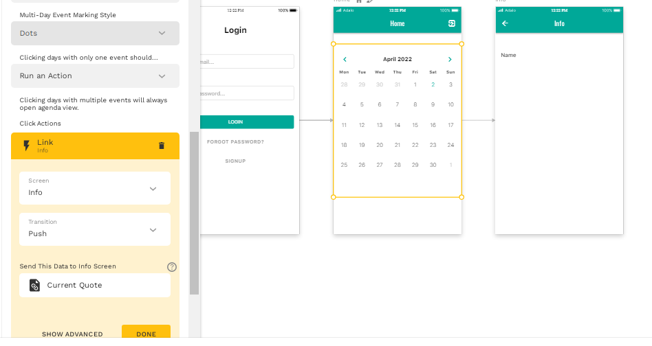 On home page, I add “Calendar” component. I added a new page with “info”, “list”. but it seems I miss an action step to trigger Calendar point to corresponding quota page. Would any suggestion how to do that ?