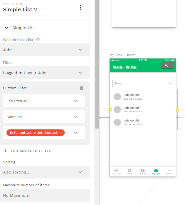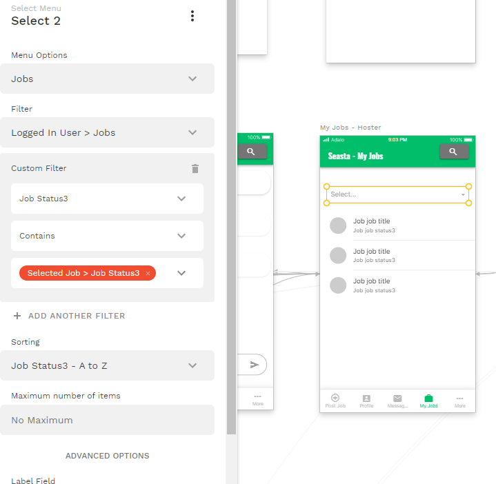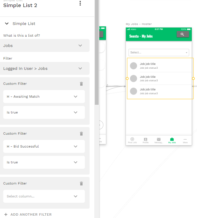 Maybe an Adalo Expert could also chime in here, but if I’m not mistaken, you don’t need a separate Collection called “Job Status”. Instead, you could have a few True/False (boolean) properties in your Job Collection. When the Job is first created, you update the “Job”->Awaiting Match to True, and Job->Active = True. Later on in your app, once conditions are met, you can use click actions (or custom actions) to update the other properties in the Current Job. ie Job->Active = False, Job->Cancelled = True.